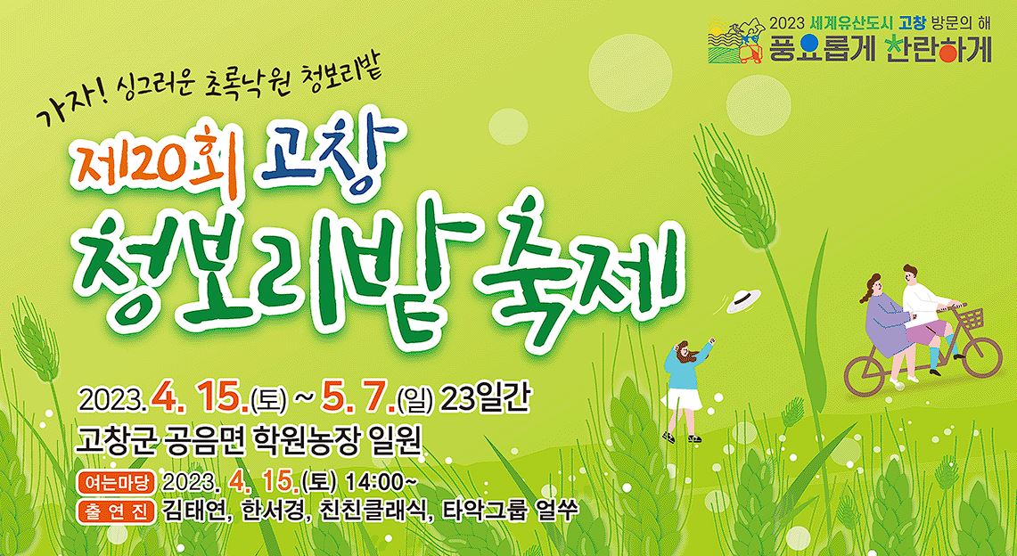 고창 청보리밭 축제는 올해 20회를 맞아 "가자! 싱그러운 초록낙원 청보리밭"을 주제로 2024년 4월 15일부터 5월 7일까지 개최됩니다.청보리밭과 유채꽃밭이 함께 어우러져 더욱 장관을 이후는 고창 청보리밭 축제 입장료 맛집 숙박 주차정보에 대해 알려드릴게요!